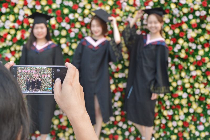 为了让同学们能在毕业典礼上拨流苏时留下一张与校领导的清晰合影,学工部今年将典礼中同时上台拨流苏的学生数量减少为十人,并利用云相册技术,设置十台联网的照相机为学生定点拍摄,由后台专人修图并上传。只需要一刻钟,学生就可以在手机扫码进入的云相册中下载自己的毕业典礼照片了。学位授予仪式尚未结束,很多学生已经开始在朋友圈分享自己的现场照片,脸上洋溢着喜悦。