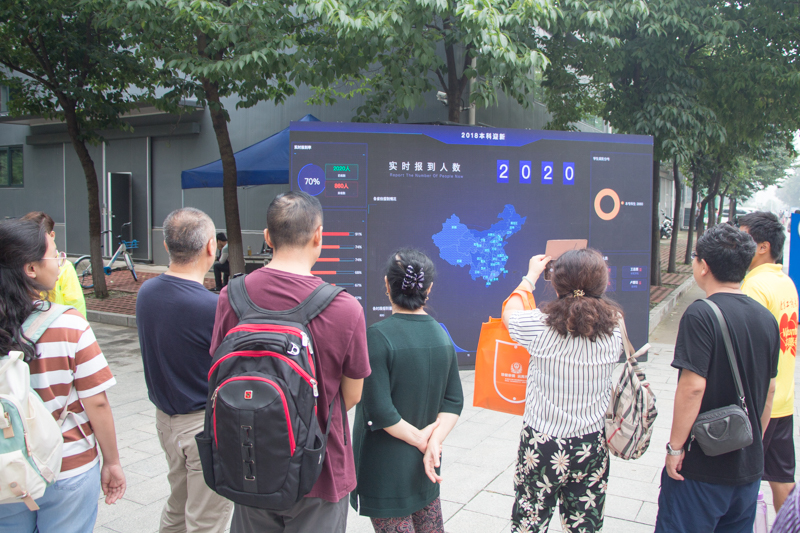 报到现场,实时反映迎新工作数据的蓝色电子屏引来新生和家长们驻足。这是学生处首次尝试全程采用电子大屏“直播”新生报到的情况,通过电子大屏,大家可以随时了解到学校和各学院新生报到注册人数以及各时段新生报到情况,充分体现了大数据时代的服务升级。