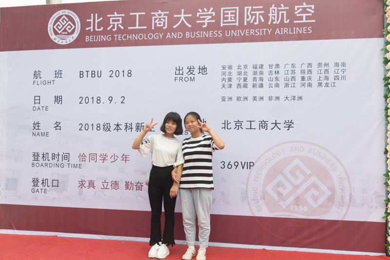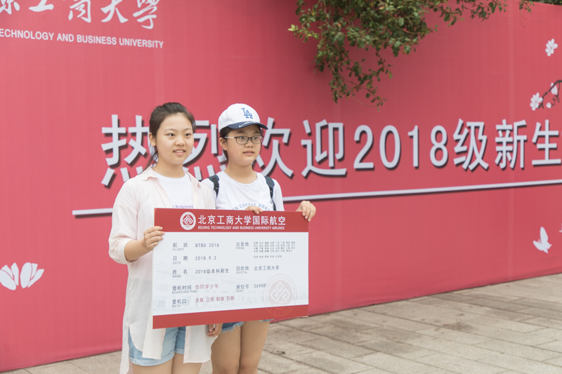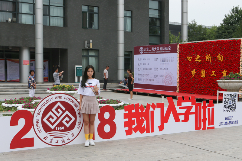 校门口“热烈欢迎2018级新同学””“2018我们入学啦” “我爱北工商”“开启新征程、谱写新篇章”的红色迎新拱门、灯柱和条幅等显得格外喜庆和醒目。