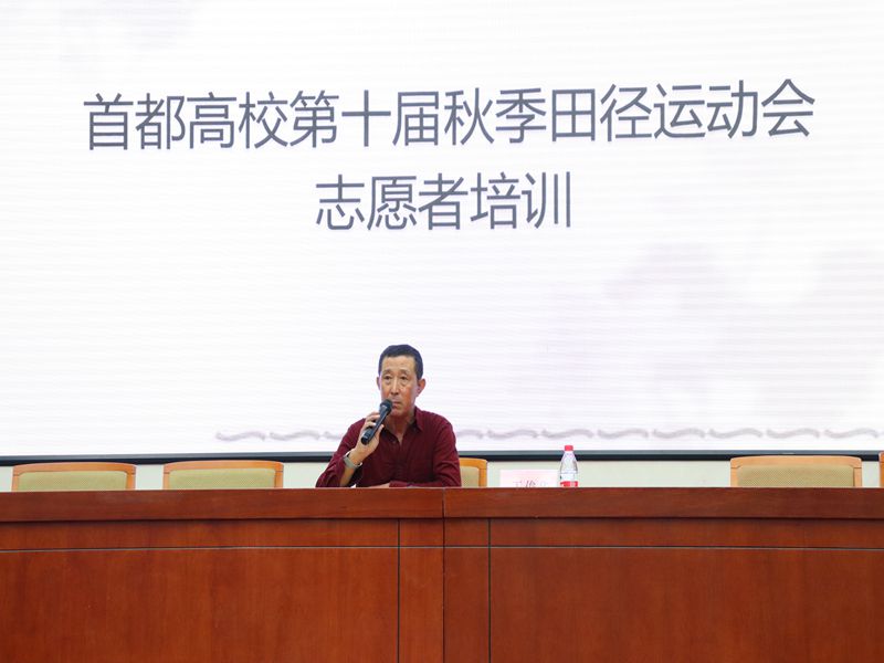 10月10日,由体育与艺术教学部和校团委联合举办的首都高校第十届秋季田径运动会志愿者培训大会在良乡校区举行。北京市大学生体育协会田径分会副秘书长清华大学王俊华教授受邀为我校志愿者进行培训,200余名志愿者参加了培训会。