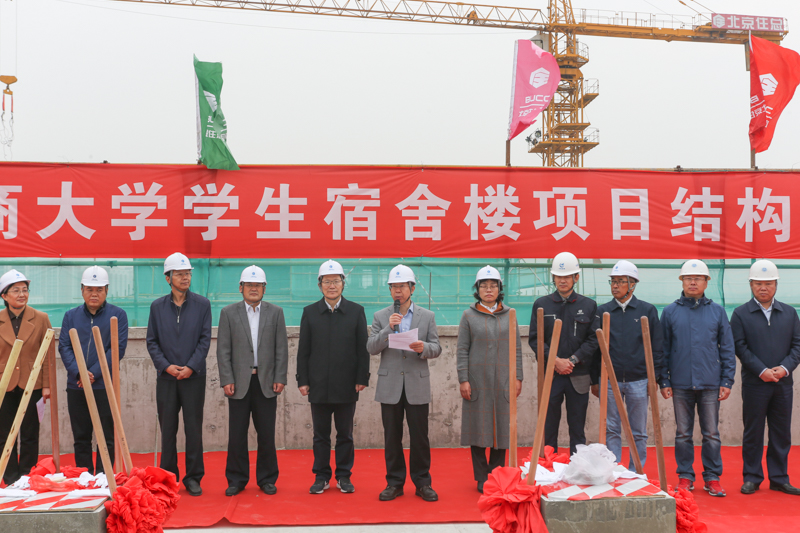 校长孙宝国代表学校全体师生向百忙中参加封顶仪式的各位领导、嘉宾朋友表示热烈的欢迎,向长期以来关心、支持学校发展的各级领导、各有关单位、各界朋友、各位校友表示衷心的感谢,向所有为良乡校区二期新建工程付出智慧和辛劳的参建各方致以诚挚的谢意和亲切的问候。他希望各个单位要牢记首都意识、质量意识、安全意识,做到精诚团结,精细管理,精心施工,同北京工商大学一起凝心聚力,抢抓机遇,加快建设具有商科、轻工和食品特色的世界一流大学,为首都经济社会发展做出更大的贡献!