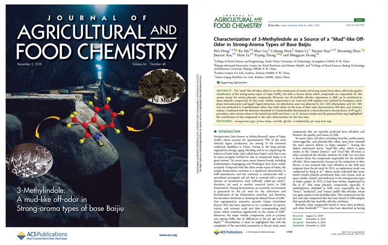 近日,我校食品学院“白酒化学”研究团队以董蔚为第一作者,孙啸涛为通讯作者在美国化学学会期刊Journal of Agricultural and Food Chemistry最新一期(2018,Volume 66,Issue 48)发表了题为 “Characterization of 3-Methylindole as a Source of a ‘Mud’-like Off-Odor in Strong-Aroma Types of Base Baijiu” 的封面论文。