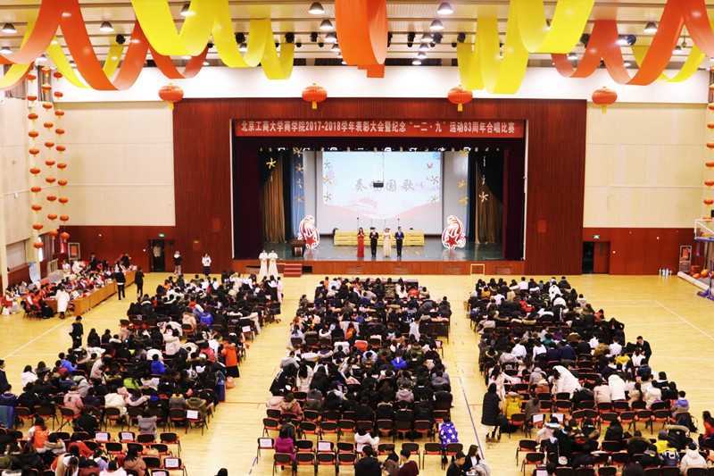 为激励学院学子奋发图强、不断进取、全面成长,增强当代大学生爱国主义理想信念和弘扬爱国主义精神, 12月9日,商学院在良乡校区举办2017-2018年学年表彰大会暨“开启新征程,歌唱新时代”纪念“一二·九”运动83周年合唱比赛。校团委书记王海伟,商学院党委书记毛新述、党委副书记樊江涛、副院长杨浩雄、各系主任、18级全体班主任、学院全体辅导员与大一学生共六百余人参与大会。