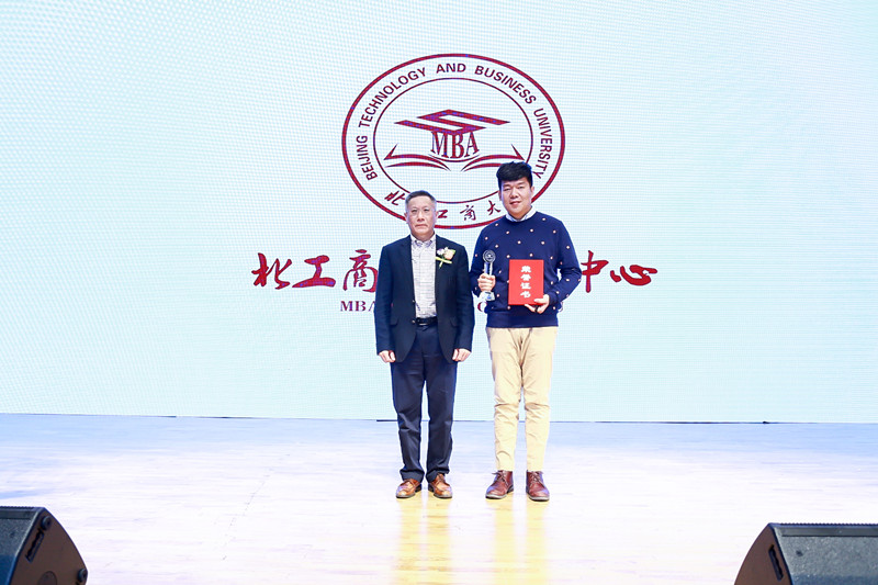 论坛现场发布了由2013级MBA学员潘岳设计的我校MBA中心标识,副校长谢志华为其颁发“最佳设计者”证书,并合影留念。
