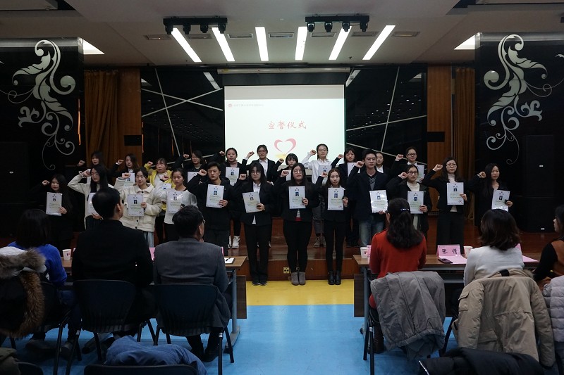 盖晓庆副处长宣读了《关于聘任2019年度“学生资助宣传大使”的决定》,并与张德玉副书记共同为新聘资助大使颁发聘书及纪念徽章。30名大使在全场老师和同学面前庄严宣誓,争做励志成才的先行者、资助政策的传播者和知恩、感恩的践行者。