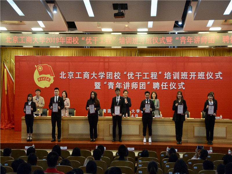 为纪念五四运动100周年,落实我校庆祝新中国成立70周年“我和我的祖国”爱国主义主题教育活动方案部署,将共青团思想引领工作常态化深入基层、走进青年,通过进团课、进支部、进网络,开展面对面、互动性的宣讲交流,激励和引领全校广大青年真正在内心深处坚定不移听党话、跟党走,着力打通青年理论武装工作“最后一公里”,校团委在全校选拔了40名政治坚定、善于面向青年传播党的理论主张的优秀青年师生组成“青年讲师团”。校团委书记王海伟宣读了北京工商大学“青年讲师团”聘任决定,与会领导为“青年讲师团”讲师们颁发了聘书。
