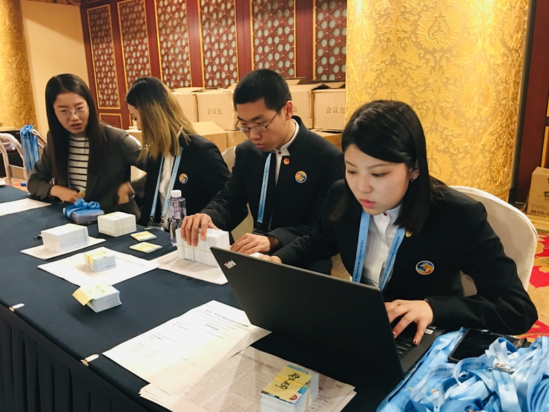 注册中心内负责12个分论坛几千名参会代表的证件发放与查询工作也如火如荼的进行。志愿者们要负责近4000份物料分装工作以及证件发放与查询工作。如此庞大的证件数量需要志愿者们时刻保持细心,并以耐心的态度去处理每一个证件反馈信息。由于参加各个分论坛的代表、嘉宾到场时间相对集中,因此提供通畅的注册通道、确保高效地处理问题是志愿者们的工作目标,志愿者们彼此勉励、相互配合、细致认真、确保每一个环节毫无疏漏。尽管每天埋头和文件、证件打交道,这批志愿者的工作在峰会正式开始前便已经结束,没有参与到论坛会场服务,但是志愿者们并不遗憾,始终以最良好的形象,站好此次“一带一路”志愿服务工作的第一班岗。
