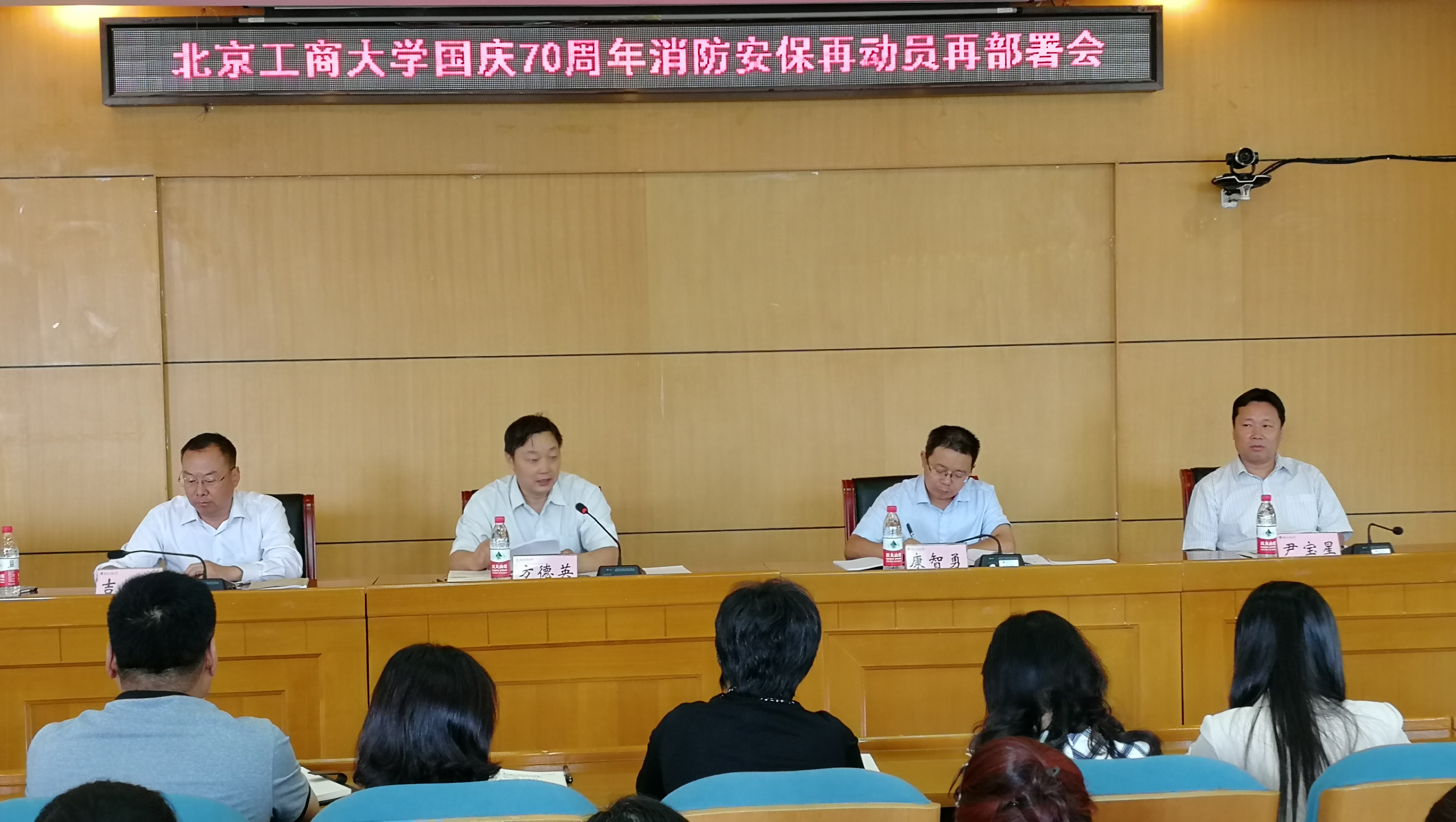 保卫处副处长尹宝星通报了暑假期间消防部门对两校区“双随机”检查和学校对各单位进行检查的相关情况,对开展消防安全隐患大扫除暨“五清”专项行动进行了部署,并对印发的《北京工商大学消防安全管理基本规范》进行详细解读,要求各单位对照规范抓好消防工作落实。国有资产管理处处长康智勇通报了学校实验室安全检查相关情况并对实验室管理提出要求。保卫处处长吉涛就加强国庆节前校园安全稳定工作从“人、地、事”等方面提出具体要求,强调各单位要按照学校网格化管理要求,抓好各项安全稳定工作落实。