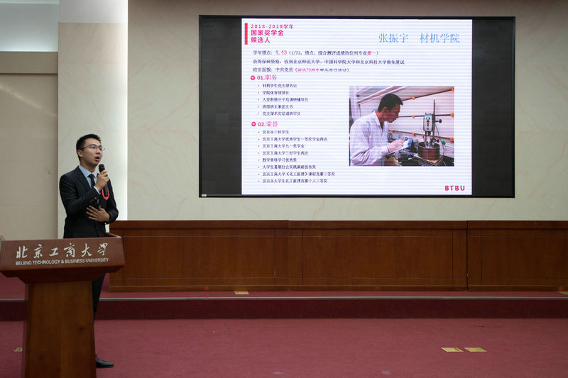 评审会在庄严的国歌声中开幕。来自11个学院的32名国家奖学金候选人按照抽签顺序依次上台,通过3分钟的演示文稿展示自己在学习、科研、学生工作、社会实践、竞赛获奖、志愿服务等方面取得的成绩。理学院宾凡淳连续3年绩点和综合测评专业第一,作为体育舞蹈队的一员,多次参加国家级、市级比赛并获得一等奖;数学与统计学院赵玉雪在数学分析、常微分方程等5门专业课程中取得满分成绩;轻工科学技术学院的杨蕴格在保持绩点综测专业第一的成绩下积极竞赛,获得全国数学竞赛二等奖,物理竞赛三等奖和北京市数学竞赛一等奖等荣誉;材料与机械工程学院魏姗姗是智能车的头号玩家,现已被清华大学机械系拟录取;计算机与信息工程学院刘紫凤成绩优异,竞赛获奖20余次,累计参加温暖衣冬等实践活动多达50余次;计算机与信息工程学院巴文岚在电路原理、概率论与数理统计等6门课程取得满分成绩,并获得单科学习优秀奖学金;经济学院黄永健热爱所学专业,已获得中央财经大学金融学院金融工程硕博连读保研拟录取资格;商学院黄永刚同学积极进取、勇于拼搏,共获各级比赛奖项40余项,发表学术论文5篇,竞赛科研双丰收;法学院胡延杰同用所思所学为法律和正义发声,大学期间征战模拟法庭比赛、辩论赛超过70场;外国语学院侯雅婷践行外语加党建,双语传播中国故事,以己所长服务国家,获北京市优秀学生干部;艺术与传媒学院李昕澍获校级以上奖项12项,所在创业团队平台月流水10万余元,学习创业两手抓。候选人的优秀事迹赢得了现场评委、老师热烈的掌声。