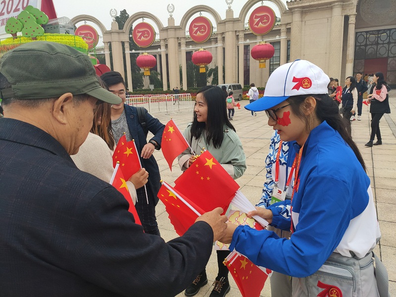 10月19日,在北京展览馆广场上进行了“我和我的祖国”快闪活动,我校志愿者参与其中,为现场参观游客发放小国旗,志愿者们饱含热情,带动现场气氛,引导现场观众融入快闪活动中来。看到整个广场沉浸在一篇为祖国欢呼的海洋中,志愿者感慨纷纷被现场浓厚的爱国气氛感动,能为参加本次志愿服务,参与到庆祝祖国70周年生日的活动感到荣幸和自豪。
