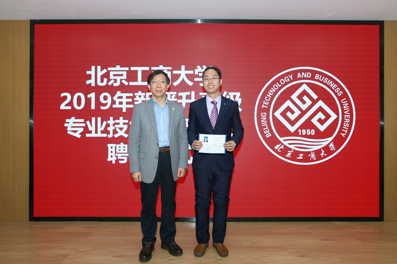 谢志华副校长宣读了《关于公布北京工商大学2019年专业技术职务晋升与聘任结果的通知》(北工商校发〔2019〕73号),王晶等86人晋升高级专业技术职务。孙宝国、谢志华、张耘、张国龙分别为新晋升高级专业技术职务人员颁发了聘书。