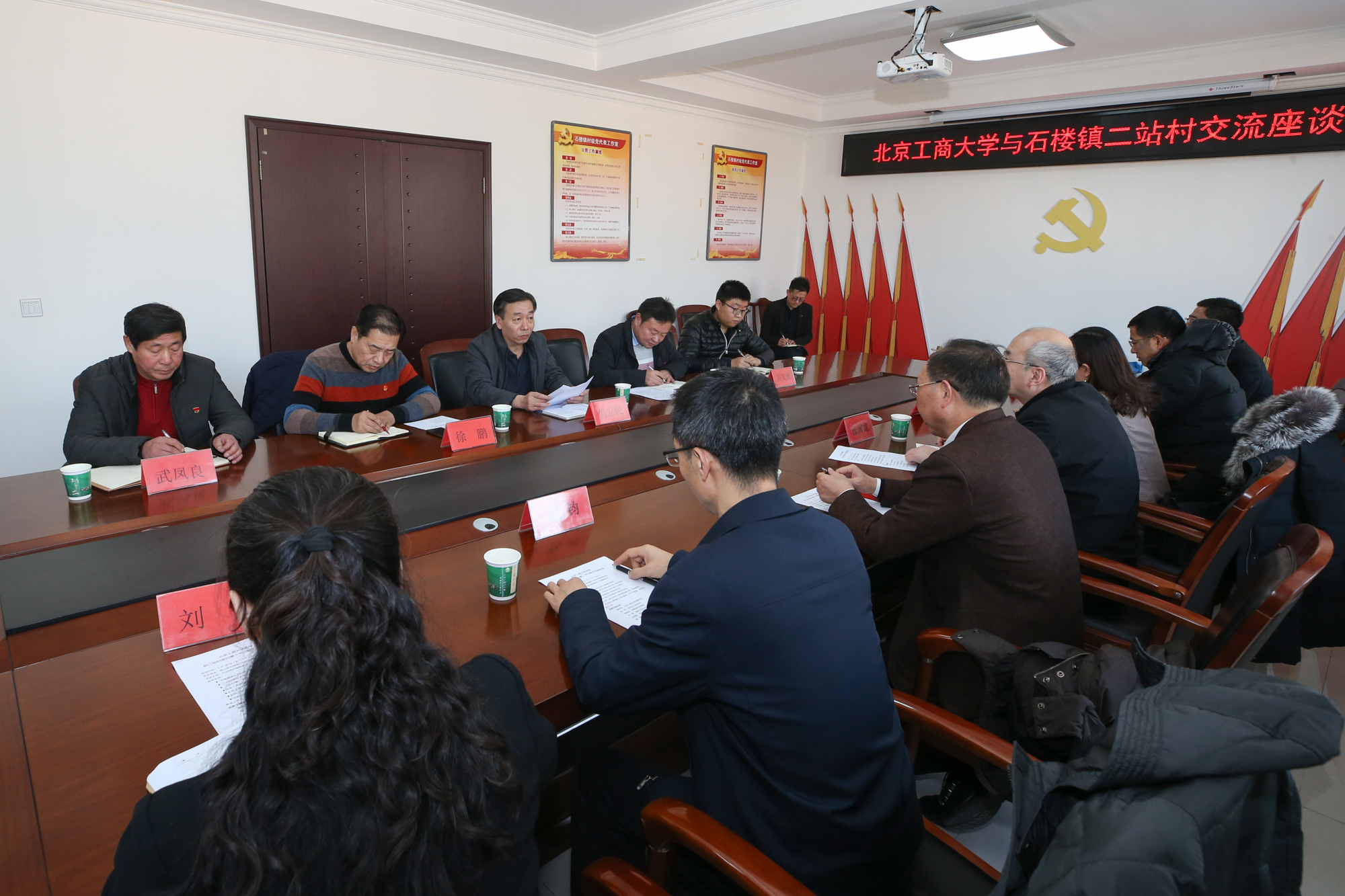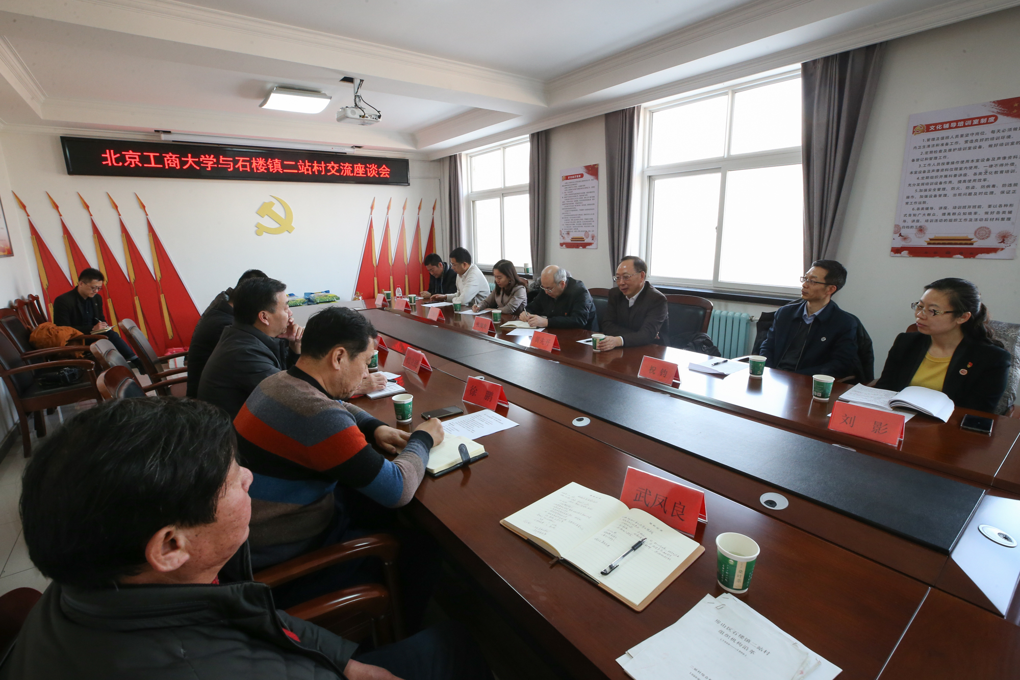 二站村党总支第一书记、我校国际交流与合作处干部刘文彬汇报了任职以来的工作,感谢学校党委给予宝贵的锻炼机会,感谢学校领导百忙之中专程看望慰问,对于学校的大力支持非常感动,他表示,在接下来工作中,一定会发扬艰苦奋斗的工作作风,继续探索学校与二站村深入合作的新模式,将北工商人的风采挥洒在京南这片宝地上。我校公共事务处干部、二站村党总支原第一书记周国强谈了两年半的驻村工作体会,感谢学校党委、村镇给予的大力支持,自己丰富了阅历,增长了才干。