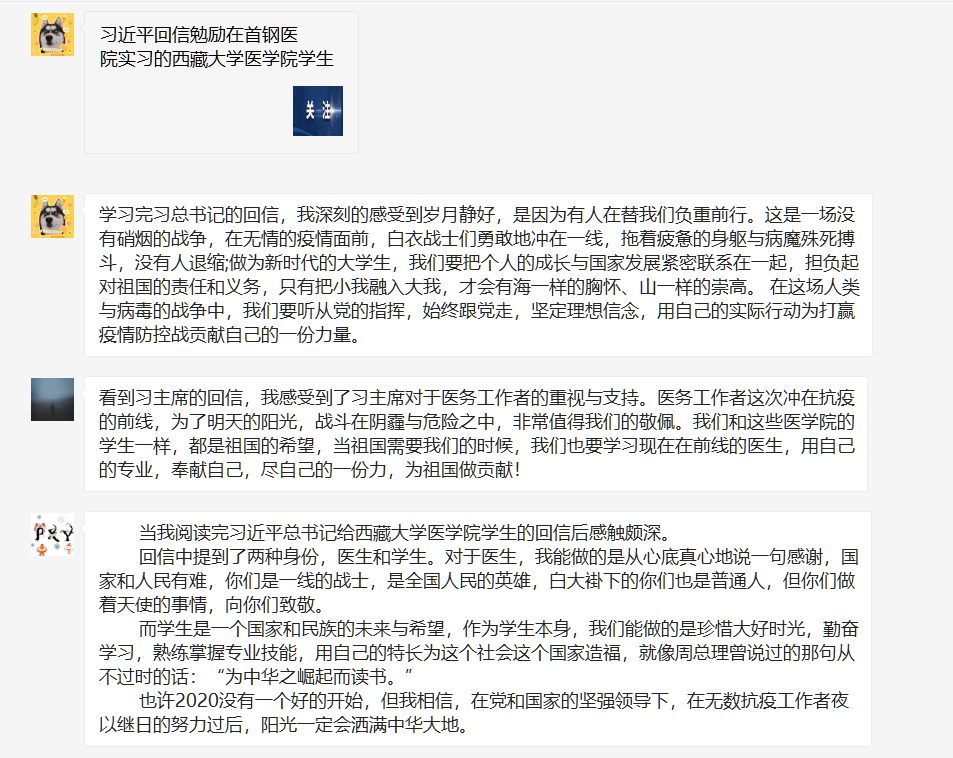 通过线上会议讨论交流及线下学习的形式,学院团委组织各团支部认真学习研读了习总书记的回信。同学们通过分组讨论、自学等方式学习了习总书记给西藏大学医学院在北京大学首钢医院实习学生的回信后,备受鼓舞,深感责任重大,在班群内写下了感悟,分享了学习心得,进一步地感受到了肩上的责任与使命担当。