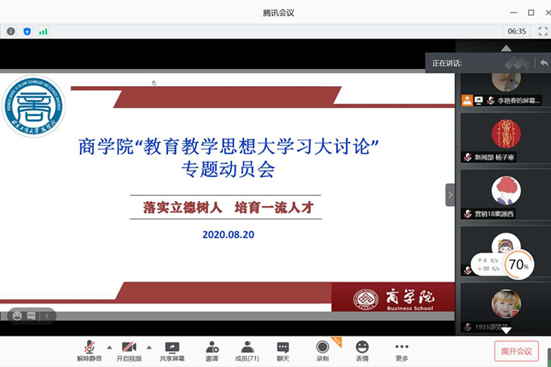 商学院于8月17日、20日召开两场主题为“落实立德树人,培育一流人才”的线上“教育教学思想大学习大讨论”专题动员会议,累计150余名师生参加动员会议。学院党委副书记张倩,全体辅导员、本研学生党支部书记、团学干部、各班骨干等参加此次会议。会议由团委书记李艳春主持。