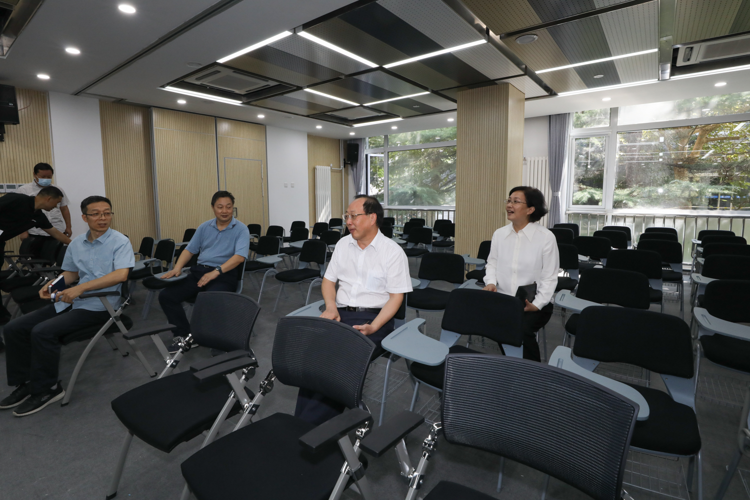 学校办公室、党委宣传部、教务处、研究生院 、学生处 、国有资产管理处、校园建设处、公共事务处、保卫处、信息网络中心等单位负责人陪同检查并进行了汇报。