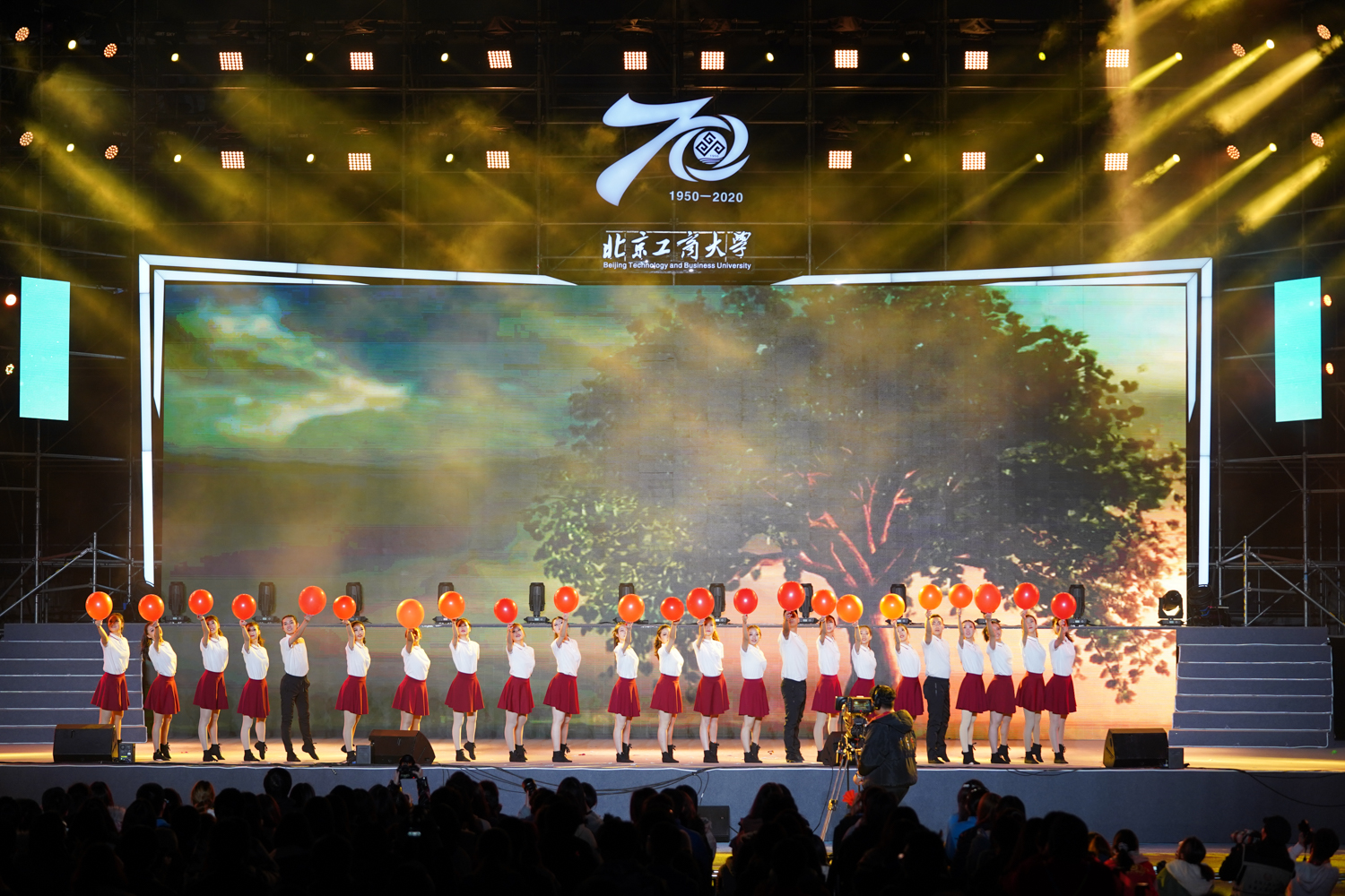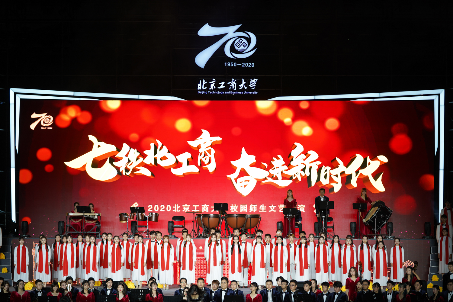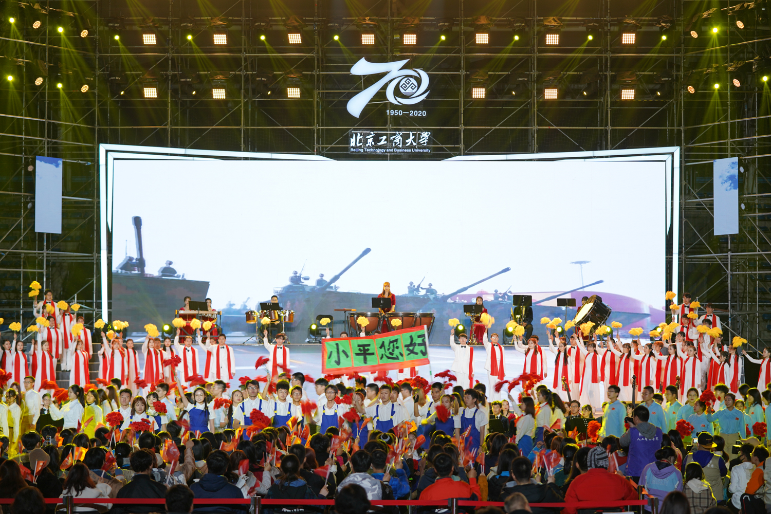 10月17日晚,2020年北京工商大学校园师生文艺汇演在良乡校区操场举行。学校领导张德玉、欧阳媛、张耘、郑文红出席活动。受邀嘉宾、校友代表和在校师生共3000余人现场观看演出,十万余名师生、校友和社会各界宾朋通过云直播同步观看,恭贺北工商七十华诞。