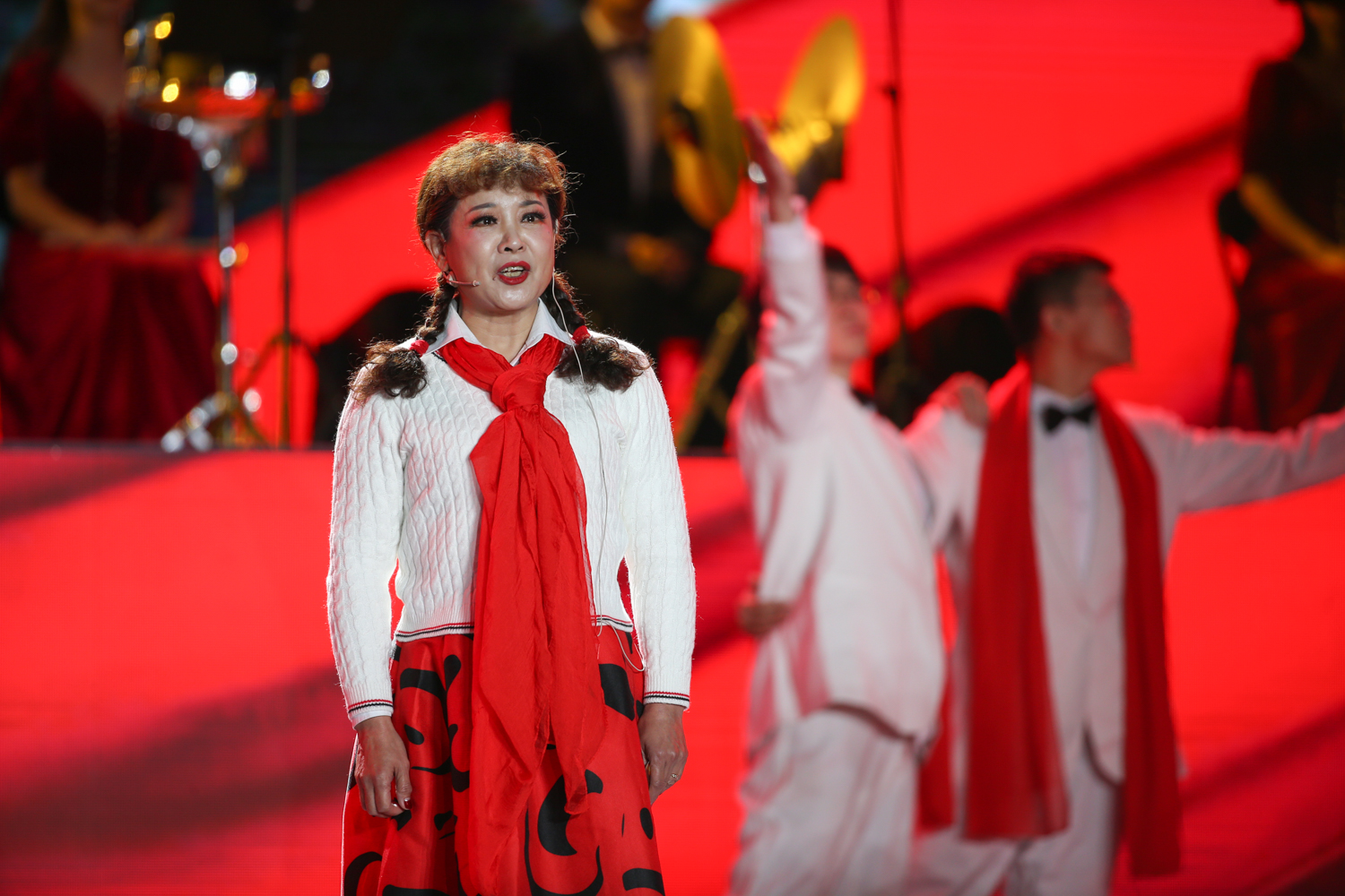 第四幕“七秩弦歌向未来” 寓意北工商在未来的征程中高歌奋进、扬帆远航。牛奶咖啡主唱、校友仙羽分享了在母校学习生活的故事,表示人生最重要的时光是在北工商度过,她现场演唱了代表作《青梅》《咖喱咖喱》,与现场师生合唱《明天,你好》,用动听的歌声献礼母校七十华诞,祝愿母校越办越好,祝福同学们前程似锦。歌曲串烧《向梦想出发》中,合唱团及校园歌手带来《离开地球表面》《三天三夜》《夜空中最亮的星》《我相信》,通过跃动的旋律和动感的舞蹈呈现出热烈的氛围。北工商退伍大学生代表《向母校报到,向祖国报道》,他们其疾如风、其徐如林,通过舞蹈编创展示绝活,英姿飒爽、朝气蓬勃,三军合唱《当那一天来临》气势如虹,展示了他们携笔从戎、英勇无畏的气概。他们齐声高呼:“兵耀工商、兵耀祖国”,铿锵有力,令现场观众热血沸腾。