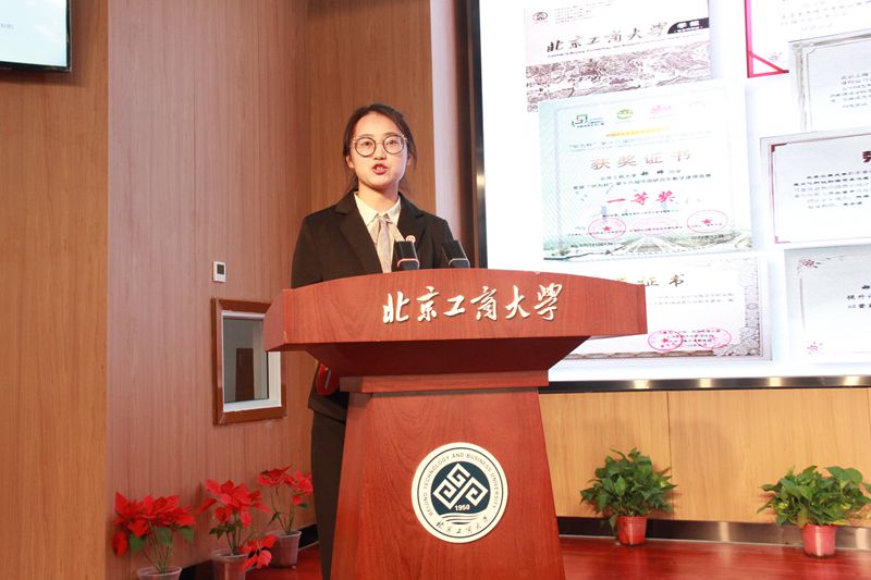 根据学科差异,答辩会分为文科组和工科组两场,工科组候选人23名,文科组候选人37名。答辩会上,60名18、19级硕士研究生候选人按照抽签顺序,依次上场进行文稿展示。每位候选人在3分钟的时间内,介绍了自己在学习与科研生活中的累累硕果。来自食品与健康学院的段雯,参与国家自然科学基金面上项目1项,目前以第一作者的身份发表3篇SCI,其中A2类3篇;以共同一作发表1篇SCI;以第二作者发表3篇SCI,其中A1类2篇,A2类1篇;还以第二作者身份发表1篇EI。来自经济学院的絮美娜,获国家级A类科研竞赛,一等奖2项,二等奖1项,三等奖2项,提名奖1项,优秀论文奖1项;获省部级B类,一等奖2项、三等奖1项;获校级C类一等奖1项、二等奖1项、三等奖2项;以导师一作学生二作发表北大核心论文1篇,会议论文2篇;负责主持北京工商大学科研能力提升项目2项。此次答辩正值学校70周年校庆之际,在场的多位候选人都为母校献上了祝福,纷纷表示希望为学校实现建设高水平研究型大学的目标贡献自己的一份力量。
