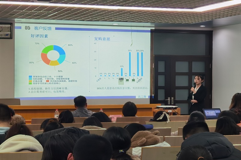 12月1日,大赛答辩会在良乡校区举行。答辩会现场,各小组代表依次登台,多元化展示了本小组在大赛各个阶段的表现和成果,专业评审老师根据各组展示情况进行了有针对性的提问。综合答辩会现场师生评委的打分情况,与之前策划方案赛、销售赛分数进行加总,最终“卖梨的小姑娘”组获得本次营销策划大赛一等奖。“白梨年华”、“七梨”两个小组获得二等奖,“梨中梨”“我们不分梨”“保二争一”三个小组获得三等奖。
