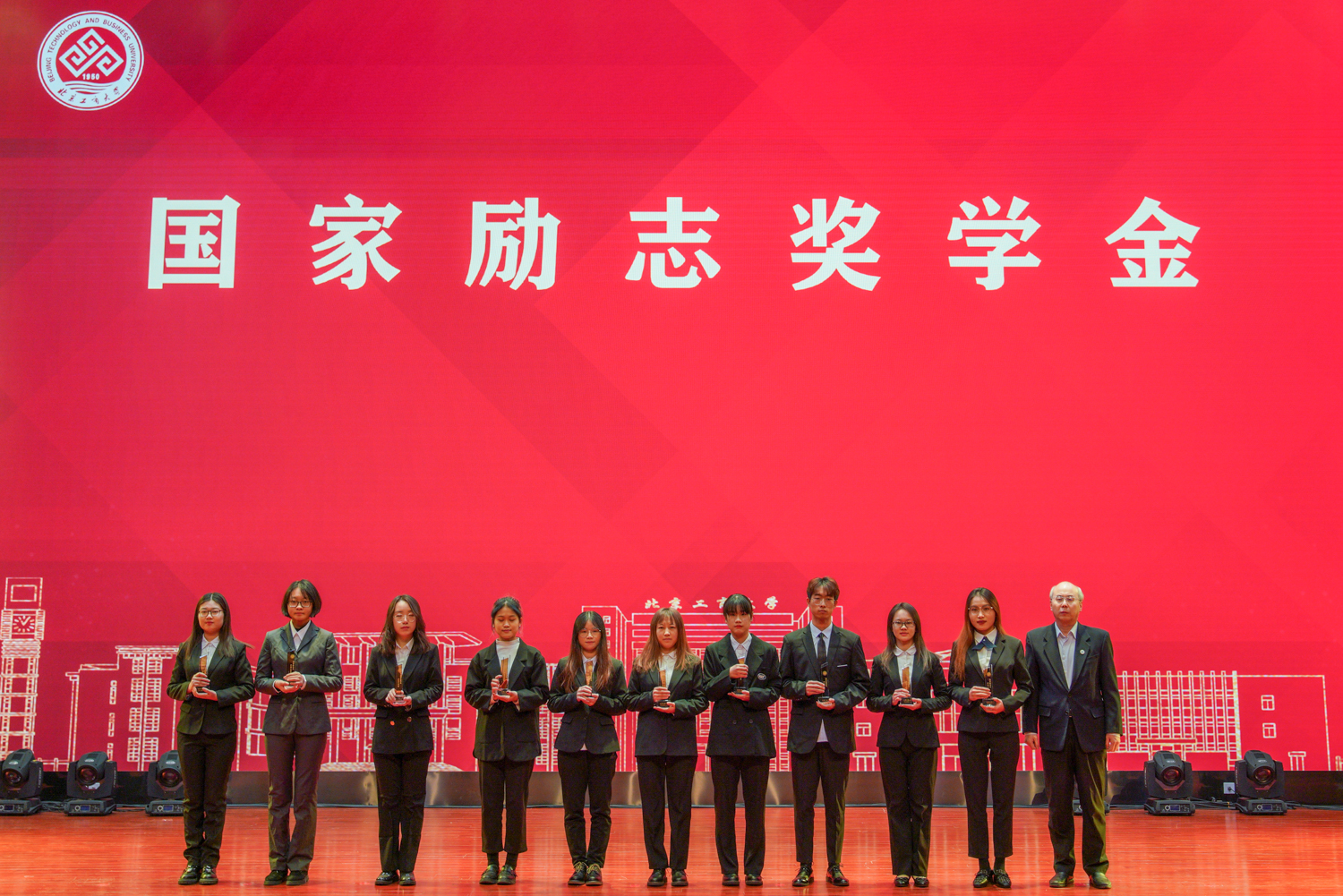 校领导、职能部门领导为国家奖学金、校长奖学金、国家励志奖学金、市级学科竞赛优胜奖、四六级考试及数学竞赛优秀学生奖、研究生拔尖创新人才质量提升奖励项目等奖项获奖者代表颁奖。同时,会议表彰了学校十佳班主任,学生为获奖教师代表献花。