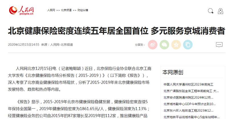 报告深入考察了北京商业健康保险市场现状,分析了2015至2019以年来北京健康保险市场发展特色、趋势和热点等内容。报告显示,2015至2019年以来北京市健康保险稳健发展,健康保险密度连续5年保持全国第一,2019年健康保险密度为1861.65元/人,健康保险深度为1.13%;经营健康险业务的公司由2015年的87家增长至2019年的112家,在售健康险产品达5000余款,涵盖医疗、疾病、失能收入损失、护理以及医疗意外保险等五大类,逐步满足了消费者多层次的医疗保障需求。
