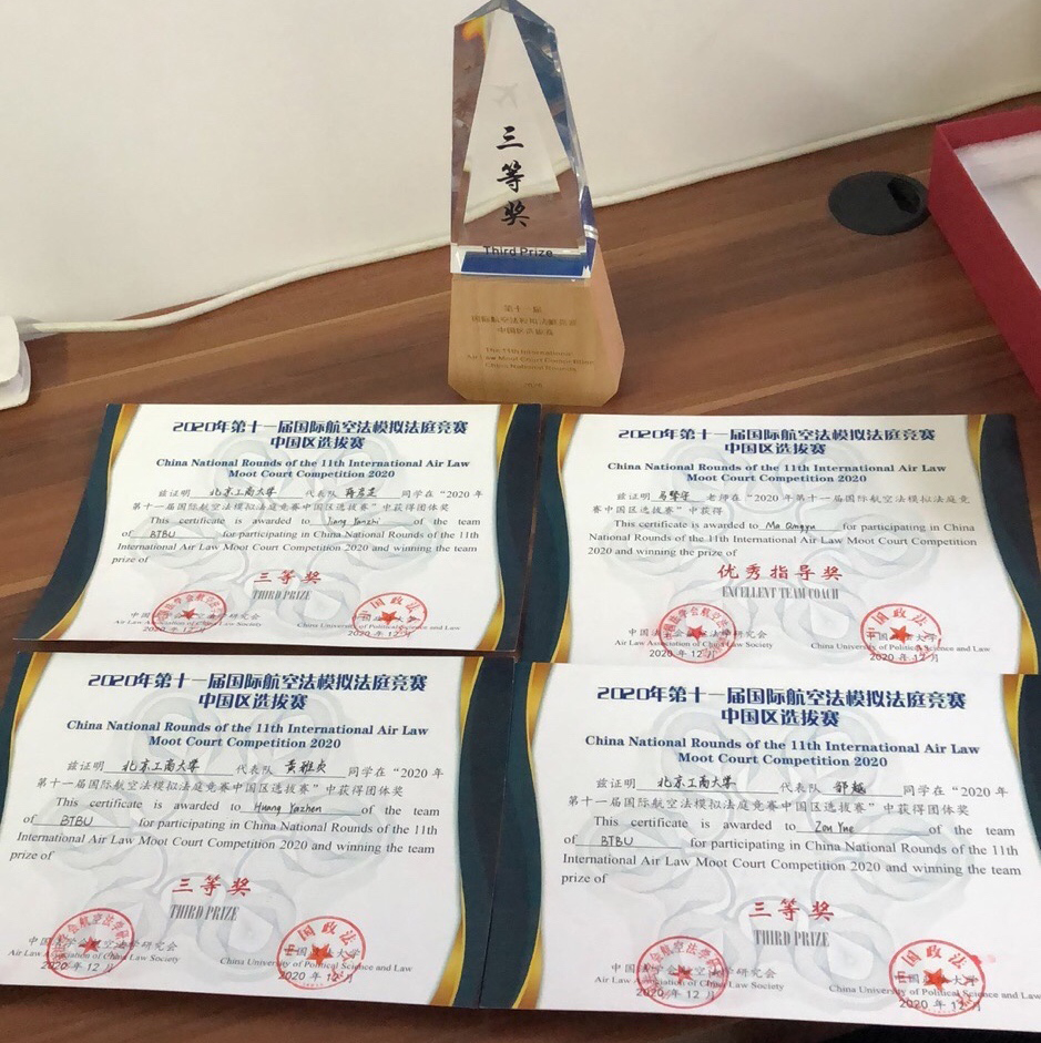 近日,“新阶段民航业新变革法律问题暨中国法学会航空法学研究会2020年年会”于云南昆明召开,公布“第十一届国际航空法模拟法庭竞赛中国区选拔赛”评审成绩。由我校法学院学生组成的代表队获团体奖三等奖,国际法学系马擎宇获优秀指导奖。