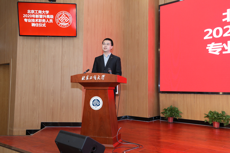 轻工科学技术学院杨绍祥、经济学院王爱萍分别代表受聘教授、副教授发言。他们回顾了在学校的成长历程,感恩学校提供的平台,感谢领导、同事们的关心和支持,并表示,面对学校高水平研究型大学的发展目标,要在人才培养与学术研究上确立更高的目标。杨绍祥谈到,要发扬“三种牛”精神,以此次聘任为新的起点,保持慎终如始、戒骄戒躁的清醒头脑,保持不畏艰险、锐意进取的奋斗韧劲,继续为北工商建设高水平研究型大学贡献力量。王爱萍提出,要坚定理想信念,以“爱”育人;坚持脚踏实地,扎实钻研;坚守家国情怀,回馈社会,将个人的发展与学科发展、人才培养工作有机结合起来。