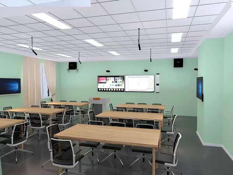 “智慧教室”具有智能化的环境控制和硬件设施。电脑、投影、灯光、窗帘和空调等硬件设备能够实现一键式操作和智能控制。减轻了老师的操作负担,设备管理人员可以远程控制和维护设备。教室采用可移动式桌椅,便于分组教学,每个小组配备了显示大屏,各个屏幕之间能够实现多屏互动。教师可独立录制完成某一节课的课堂教学内容,无需另请公司或购买设备进行课程录制,减少了人力和经济成本。录制的视频可用于微课演练,方便督导专家观看教师教学实况,精准把脉,对症下药。另外,教师还可在智慧教室完成某个知识点讲解视频的录制,上传到线上教学平台,方便学生反复观看。同时,“智慧教室”具有教学大数据收集和分析功能,实现教学分析和教学督导的数据化、智能化和全面化。避免传统模式下采样数据少,主观成分多的弊端,实现精准化的教学评估及管理。