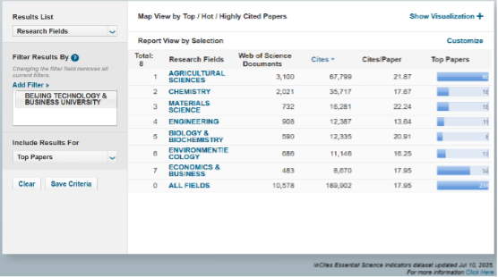 据科睿唯安(Clarivate)2025年7月发布的最新一期《基本科学指标数据库》(Essential Science Indicators,简称ESI)统计数据显示,北京工商大学经济学与商学(Economics & Business)学科首次进入ESI全球排名前1%,实现学科建设历史性突破,标志着我校经济学与商学进入国际高水平学科行列。我校目前已进入ESI前1%的7个学科具体表现如下: