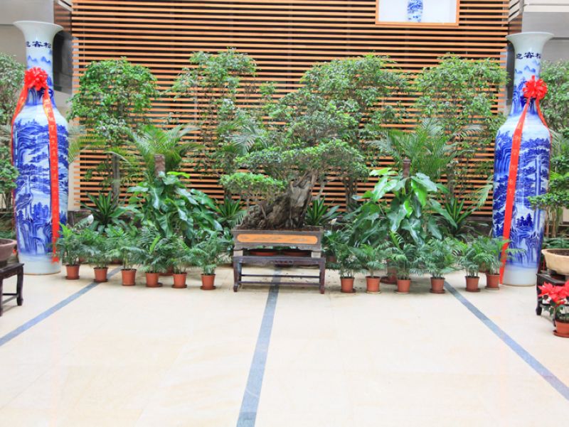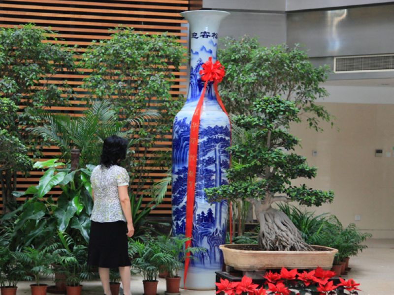 青花瓷是景德镇的骄傲,是景德镇传统名瓷中影响最大的品种之一,因而驰名中外。瓶,谐音“平”,是中国古代吉祥观赏器物。此青花双瓶寓意“平平安安”;釉中彩工艺,特大窑烧制,成功率偏低;手绘迎客松图案,寓意迎送八方学子;瓶高三米,婷婷直立,是目前北京地区最高的一对产自景德镇的青花瓷瓶。