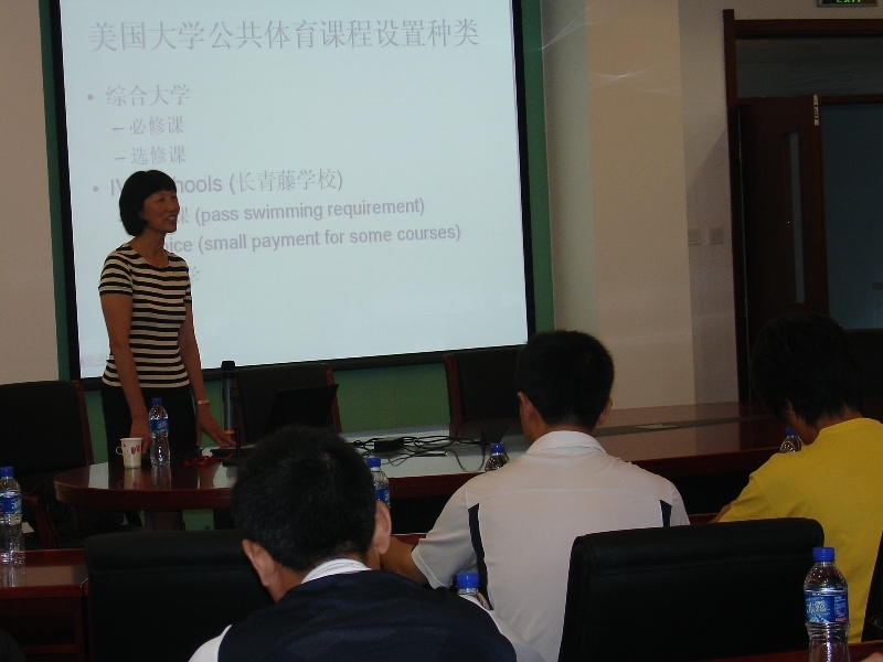 7月8日,应我校体育与艺术教学部邀请,美国南康涅狄克州立大学教授杨进进博士来到我校阜成路校区,为我校体育教师举办了题为“美国大学公共体育课程”的主题讲座。中国人民大学、北京邮电大学、首都师范大学、北京建筑工程学院、北京联合大学体育部教师应邀出席,体育与艺术教学部林永和教授及全体体育教师聆听了讲座,体育与艺术教学部主任顾红主持讲座。