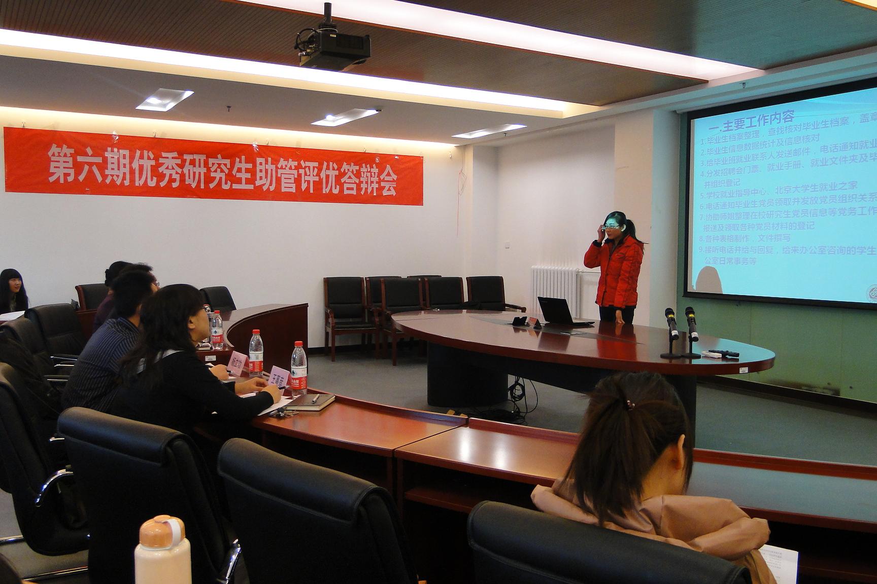 12月28日下午,第六期优秀研究生助管评选答辩会在阜成路校区进行。财务处处长陈轲、学校办公室副主任武晶晶、人事处副处长杨立功、档案馆副馆长兼校友会副秘书长王嘉彦、学生处副处长徐红京、图书馆副馆长李艳芬、研究生部党总支副书记熊慧应邀出席并担任评委。经过个人申请、用人部门推荐及研究生部助管团队审核,从102人的助管团队中,有51名助管获得了评优答辩资格。通过教师评委打分和学生互评最终评定出第六期研究生优秀助管三星级10人、二星级14人、一星级26人。