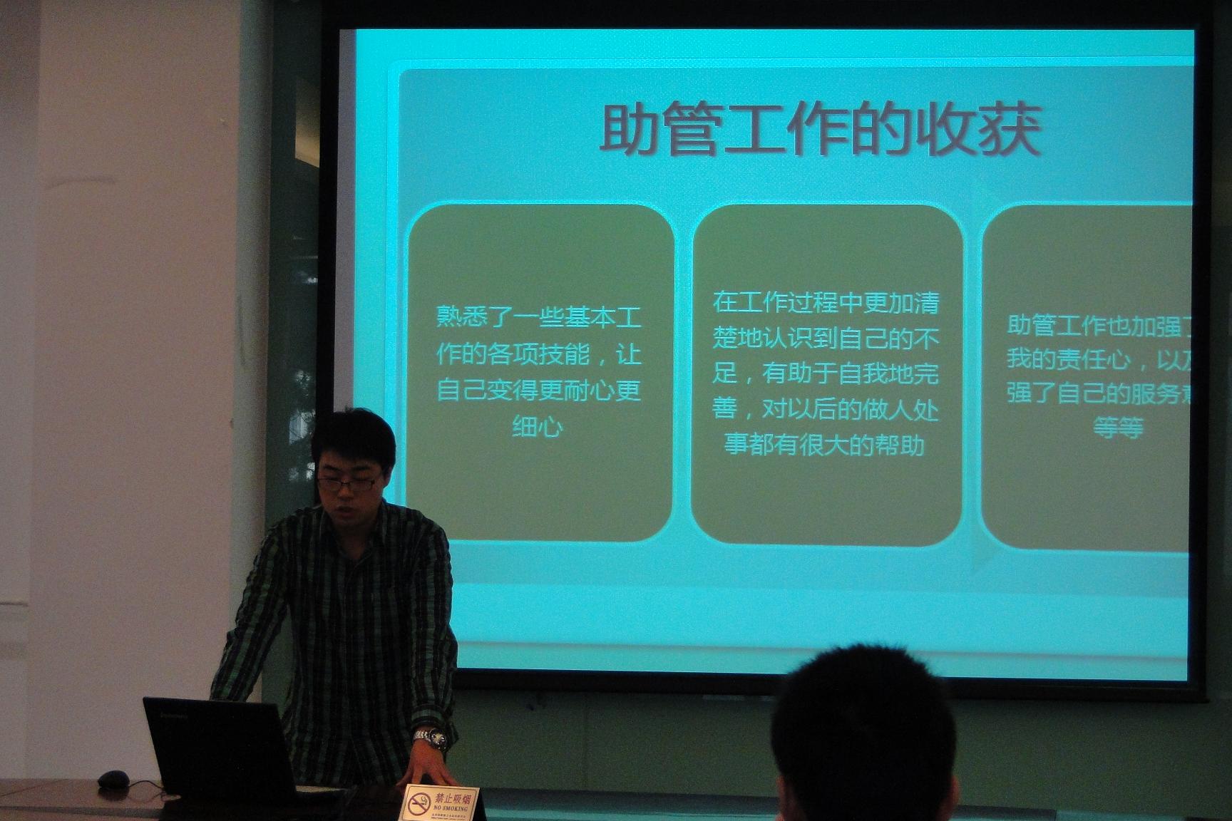 答辩环节分为3分钟ppt展示和2分钟提问应答。每位同学通过图文并茂的PPT展示了自己的工作岗位与内容,心得体会与感悟、以及对用工部门和助管工作的建议等。每位研助管都从自己的工作经历中总结经验,发表感悟,并对评委老师的提问一一作答。大家普遍认为,助管是一个很好的实践机会和成长平台,通过一学期的助管工作,自己的大局意识、责任感和自信心变强了,办事能力、人际交往、组织协调能力也得到了不同程度的提升。此外,每位助管同学也在答辩会上对曾经帮助、指导过他们的老师致以深深的谢意。