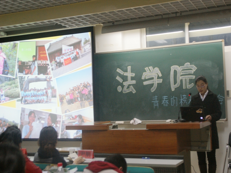 在主持人的介绍下,法学院5名“青春榜样”依次登台。法学091班的刘伟向同学们讲述了自己边读书边侍奉生病母亲和打工养家的经历。法学091班顾喜艳同学讲述了自己面对家中突如其来的变故如何承担责任。不仅如此,她还尽自己所能利用自己打工挣来的钱资助了一名小学生。她的朴实感染了在场同学,同学和老师们潸然泪下,给予了顾喜艳热烈的掌声。2011年国家奖学金获得者093班的高扬着重介绍了个人的职业生涯规划和奋斗经历,讲述自己如何坚定信念,不断努力,自强不息,实现自己心中的目标。全部以英文方式展示的PPT,流利的演讲中时不时地夹杂着富有磁性的英语口语,把整个报告会到推向了高潮。2011级的臧元田则是用幽默的方式讲述了自己如何帮助同学的故事,从身边的小事学习雷锋。101班的赵慧芳和在场同学分享了自己充实的大学时光,她是笃志好学的榜样,她说:“我是个闲不住的人,学习之余我会经常参加各种活动,通过活动我真的收获很多”。