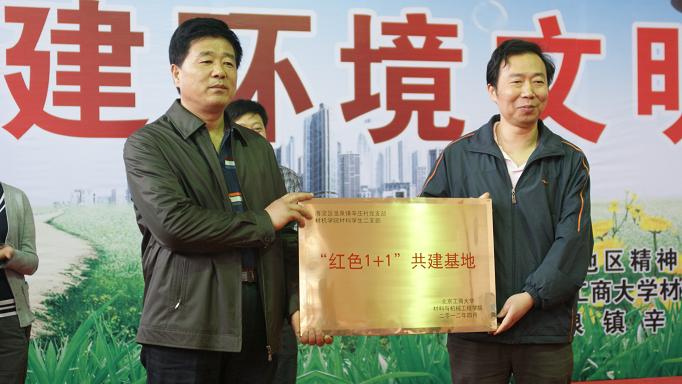 上午9时,活动启动仪式在温泉镇辛庄村文化活动中心隆重举行,会议由温泉镇党委委员、北京工商大学材料与机械工程学院校友张月娥主持。学院院长蔡强介绍了学校和学院的发展历史、现状以及学院党学生支部的基本情况,并代表学院向辛庄村党支部授红色“1+1”共建基地牌匾。随后,温泉镇机关团支部书记缪天哮作为环保志愿者发表环保倡议,号召大家一起共建生态、文明的生活环境。最后,温泉镇镇长程培衡讲话,他对学院学生党支部和教工党支部的到来表示热烈的欢迎,并希望双方可以互惠互赢,建立长期共建关系。