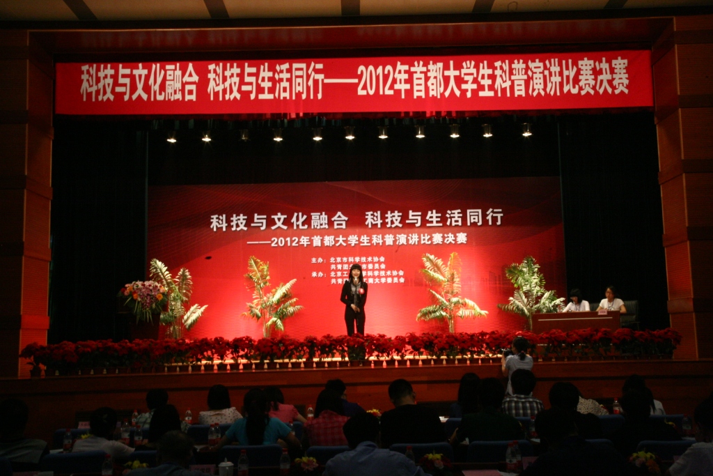5月20日下午,2012年首都大学生科普演讲比赛决赛在北京工商大学隆重举行。活动由北京市科学技术协会、共青团北京市委员会共同主办,北京工商大学科学技术协会与共青团北京工商大学委员会承办。共青团北京市委员会大学部部长张秀锋,北京市科协科技咨询中心主任何素兴,北京市科协科普部副部长姚仪鸾,北京工商大学副校长方德英,北京市科协委员、北京工商大学学校办公室主任王小艺,科技处处长杨有红,团委书记吕良,科技处副处长钱立军出席了本次演讲比赛。