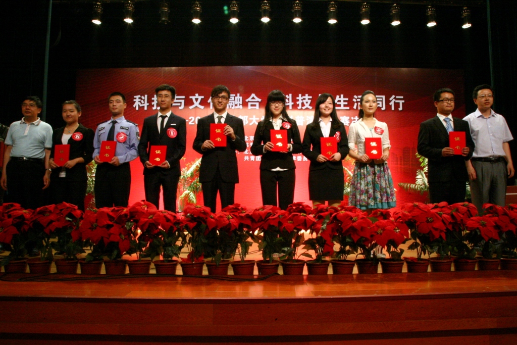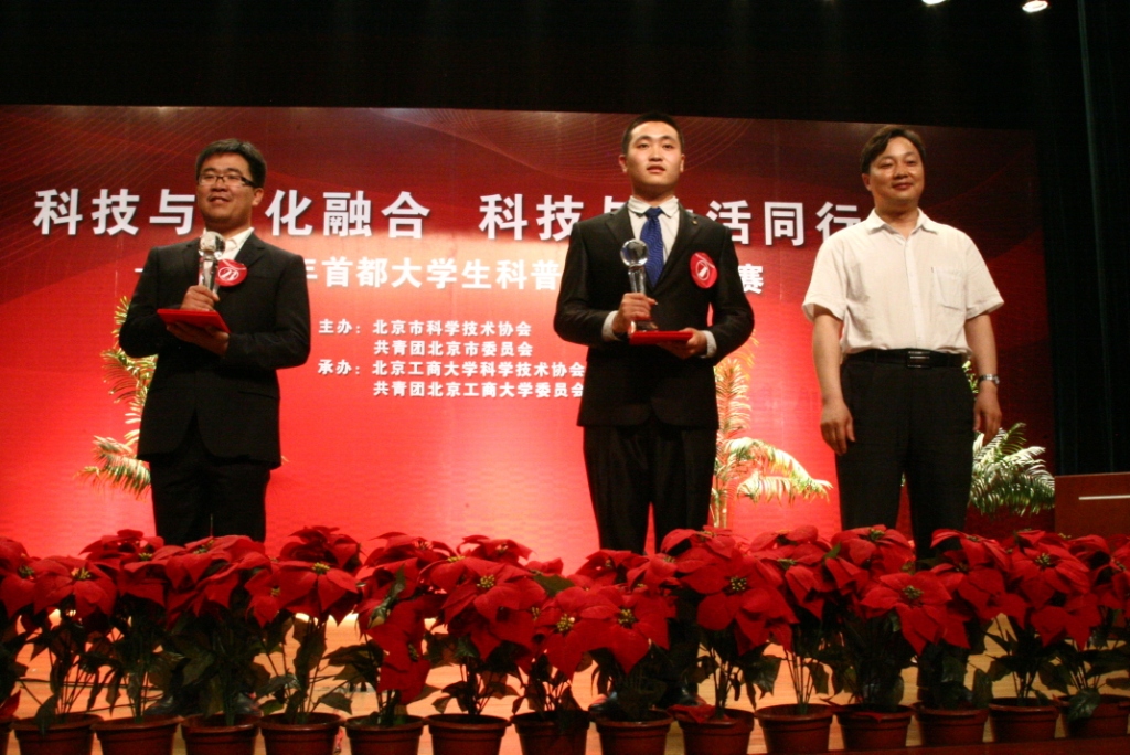 北京工商大学科技处副处长钱立军为优秀组织个人奖颁奖;北京工商大学团委书记吕良为优秀组织奖的学校颁发了奖牌;北京工商大学校办主任王小艺、科技处处长杨有红为获得三等奖的选手颁发证书;北京市科协咨询中心主任何素兴为获得二等奖的选手颁发荣誉证书;北京工商大学副校长方德英为获得本次比赛一等奖的2名演讲者颁发了奖杯。