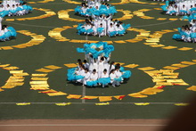 表演前,全体参演同学齐声高喊:“加油!加油!加油!”为自己的最后一次演出鼓劲助威。烈日照耀下的红黄彩旗和蓝色扇子更加鲜艳、耀眼,每一个表演细节和每一位同学的表情都更加明显。同学们精神饱满,动作干净利落,富有张力。伴随着歌曲《我的北京我的家》激扬的旋律,蓝色波浪在炽热的阳光下层层荡漾,红黄旗帜飘荡眼前。当音乐声结束,画面定格在用红黄旗帜所摆成的“BTBU”,同学们两个多月的辛苦训练在这一刻画上圆满句号。