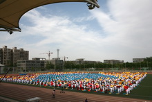 千人团体操是我校历史上首次大型的团体操表演。开学之初,体艺部王立红、武博等老师就投入到创编团体操的系列工作中。整个团队大胆选材、创新设计,在有限的时间内完成了整套动作的编排。据组织者王立红老师介绍:为给全校师生呈现一出场面宏大、精彩绝伦的表演,从3月初接到任务,4月9日完成整体构思,到第一阶段训练开展,再一步一步修正、理论设计和实际操作相结合,前后花费了一个多月的时间。创编团队从两百多首歌曲中,选出了《阳光体育》、《相亲相爱》、《我爱你我的北京》三首作为背景音乐。它们既体现了北京精神,又展现了我校和谐的文化氛围。训练的过程中,同学们的集体意识逐渐增强。这是老师最愿意看到的,也是学生们最大的收获。