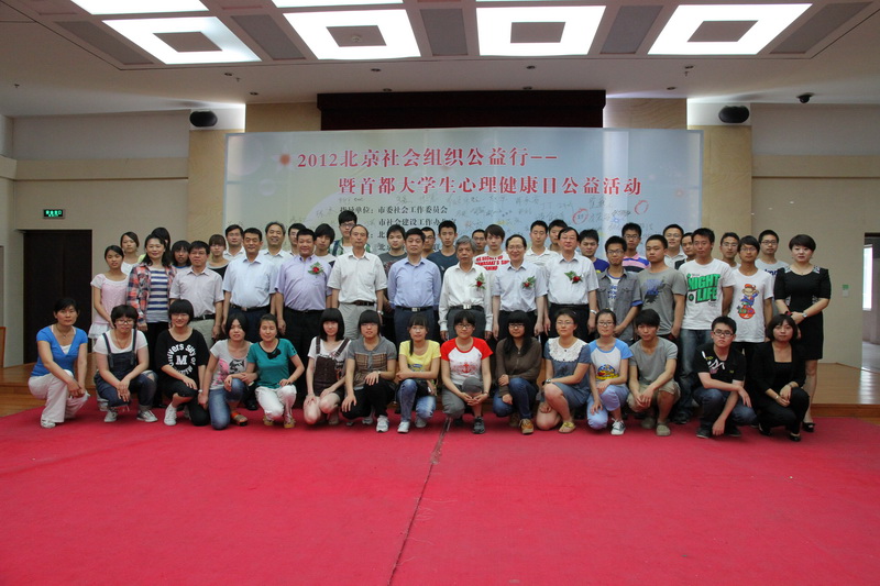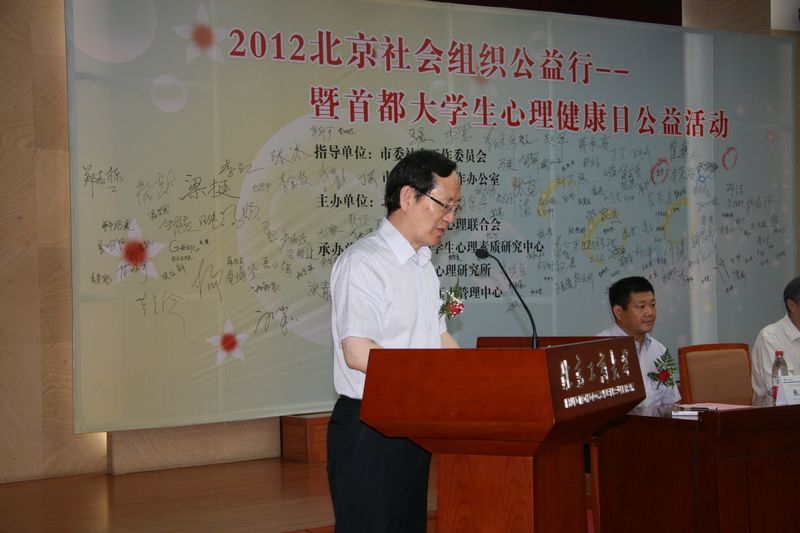 今年,在首都第十三个“5.25”大学生心理健康日到来之际,市委副秘书长王翔、市委社会工委副书记,市社会办副主任张坚、市委社会工委委员,市社会办副主任刘轩、市社会办副巡视员张青之等领导莅临我校,在校长谭向勇和党委副书记卢思锋的陪同下,来到大学生中间,参加由我校和北京市社会心理联合会主办的“2012北京社会组织公益行暨首都大学生心理健康日公益活动”。活动启动仪式由学校党委副书记卢思锋主持。