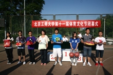 与此同时,篮球场上,体育文化节也进行了最后一个项目——3V3篮球赛的决赛。赛后的闭幕式上表彰了承办足球联赛、3v3班级篮球赛、排球联赛、乒乓球班级团体赛、羽毛球班级团体赛、网球赛、毽绳比赛、定向越野赛八项活动的体育类社团,并赠送纪念品。北京市大学生体育协会主席杜松彭发表讲话,对大学生积极参与体育活动的态度进行了赞扬及鼓励。