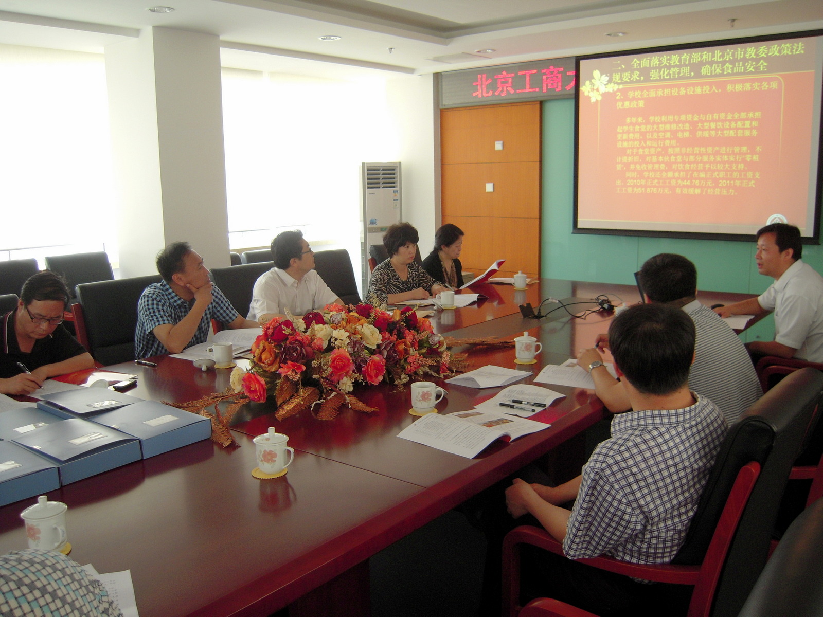 后勤管理处副处长尹宝星汇报了我校落实教育部和市教委政策情况,详细汇报了学校给予补贴支持、积极落实各项优惠政策、全力办好基本伙、扎实做好食品卫生安全工作与安全生产、积极参加高校伙联采、做好外包食堂监管、推进标准化食堂建设、落实食堂日核算月结算以及办好清真食堂等十个方面工作。专家组对我校政策落实情况和有关工作的落实情况给予了充分肯定。