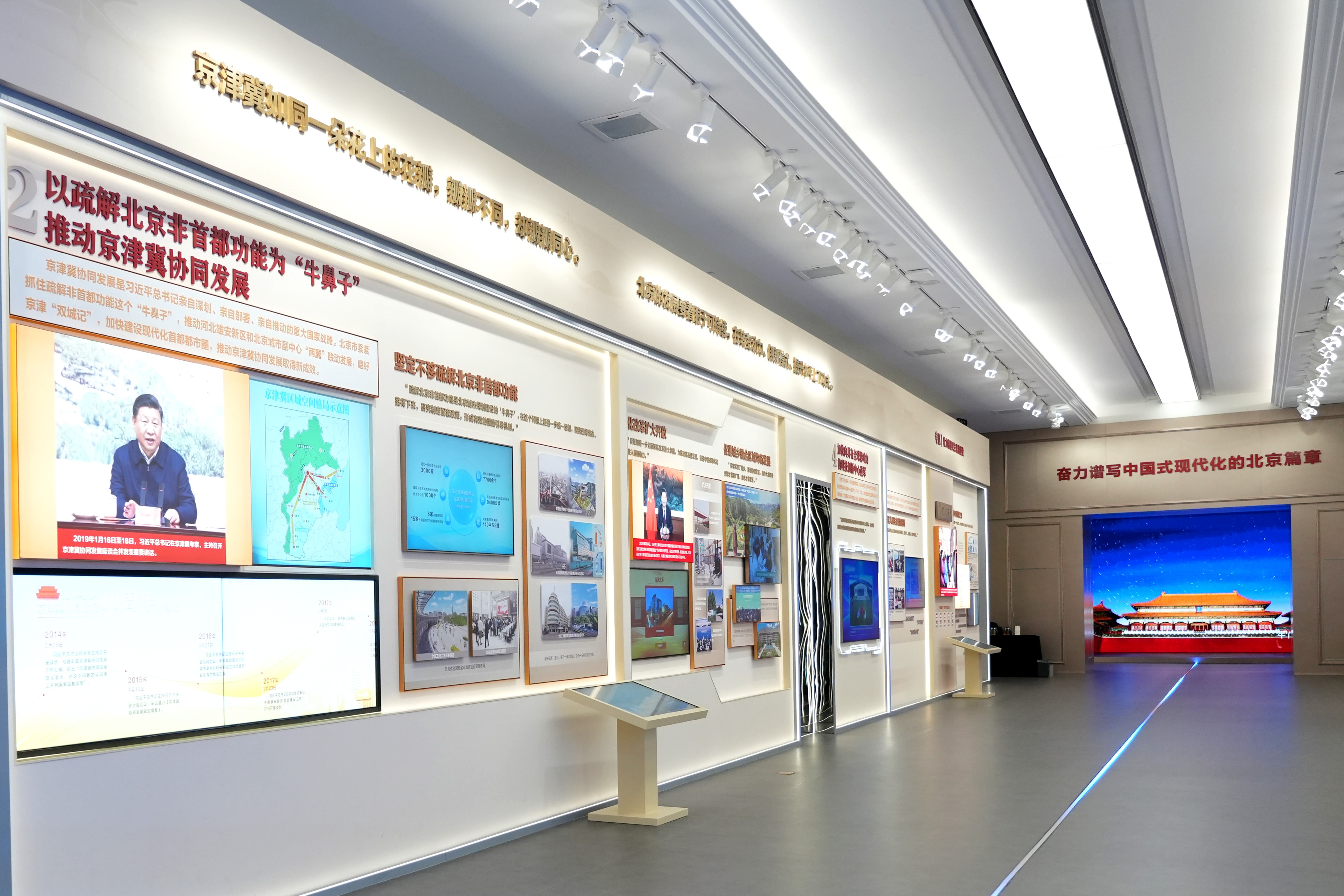 北京市委党校京华实践教研中心由京华实践主题教室、“行走京华大地感悟思想伟力”实践基地矩阵、理论研究成果应用平台及党校“五位一体”教学模式四方面内容集合而成,是习近平新时代中国特色社会主义思想学习教育的重要阵地。整体展陈按照“金句+例证+成效”的逻辑展开,融入了大量案例、数据和场景。以思想引领实践,以实践阐释理论。