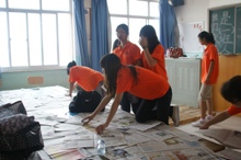 下午,实践团师生来到了同学们实践期间生活学习的“主战场”--教学楼。由于石楼中学的教学楼、宿舍楼还在建设之中,实践团的学生需要克服许多困难。两间大教室,34张床板铺在地上,这就是同学们的宿舍。条件虽然艰苦,却没有一个人抱怨。整理好床铺,同学们马上投入了紧张的备课,为接下来的实践活动积极准备着。实践第一天,同学们已经培养起了责任心与信心,在讨论中期待着2012年夏令营的正式到来!