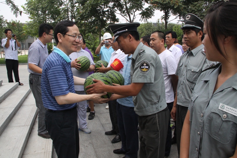 谭向勇校长代表学校党政对后勤管理处、规划建设处、保卫处及物业公司的同志们坚守岗位表示慰问,对大家辛勤工作表示感谢并赠送了慰问品。谭校长表示,今年暑期北京雨水比较多,学校的防汛工作应对有效,学校的基础建设和生活区回购后的各项工作正在紧锣密鼓的进行,他感谢大家在高温天气仍坚守岗位认真工作,保障假期校园水电、餐饮、学生管理、物业管理、维修、绿化等各项工作的正常运行和校园的安全稳定,希望大家继续努力,加强工作,为新学期开学做好各项准备和保障。