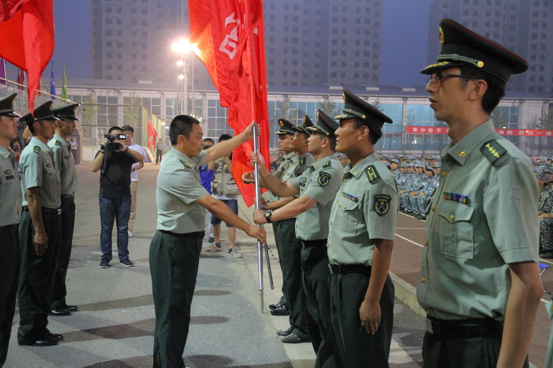 党委书记孙尧东庄重地将团旗授予军训团团长王学东。王学东中校向各营营长授旗。