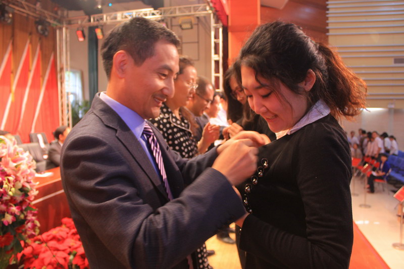 接下来八个学院的院长依次寄语在场的所有研究生,院长们希望新生同学们明确目标、勇于超越、快乐学习、健康成长,成为德才兼备的人才,留下美好的人生回忆,之后分别给各学院研究生代表佩戴了校徽。