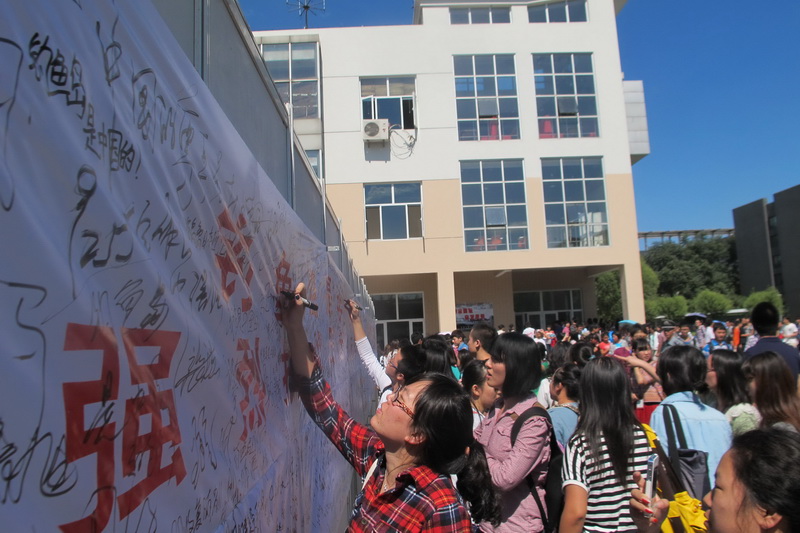 在阜成路校区和良乡校区的签名现场,一侧陈列着我国政府和各社会团体关于钓鱼岛问题的声明、九·一八事变和钓鱼岛是中国固有领土的史实资料展板,一侧悬挂着白色布幔横幅:“勿忘国耻,捍卫主权,振兴中华,从我做起”、“钓鱼岛是中国固有领土,强烈抗议日本政府非法购岛!”学生们纷纷在横幅上表达自己的心声以及签上自己的名字: “钓鱼岛是中国的,捍卫中国领土完整”、“钓鱼岛是中国固有领土”、“还我钓鱼岛”等留言强烈地表达了大家的爱国之情以及对日本的极右翼势力的愤懑之情。