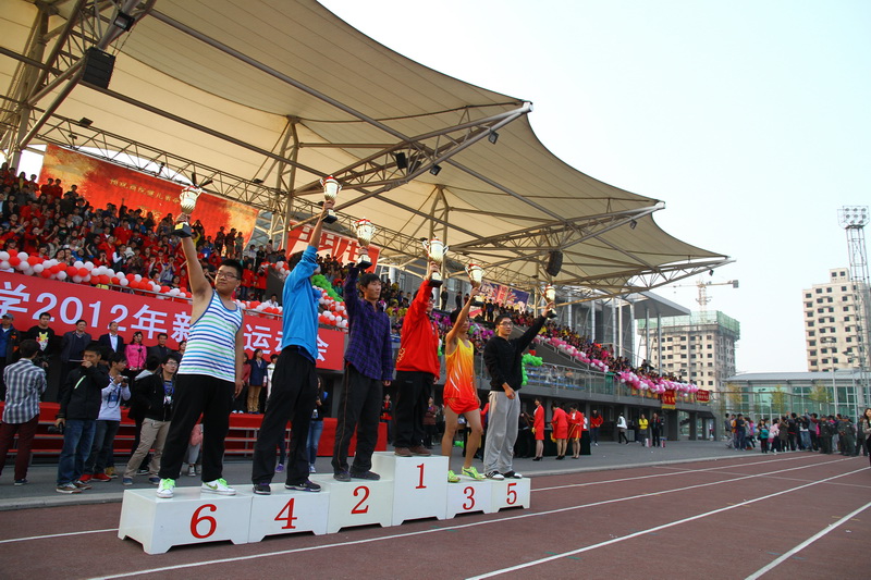 伴随着一阵阵激情洋溢的欢呼声和掌声,“最佳拉拉队”、非田径项目团体获奖单位,男子团体、女子团体、男女团体获奖学院依次公布,并颁发奖杯。站在领奖台上的运动员代表,高举手中的奖杯,向看台上一直为他们呐喊加油的同学们表示感谢,共同高喊着激情的口号。此刻,拼搏的汗水凝聚成获奖的喜悦。