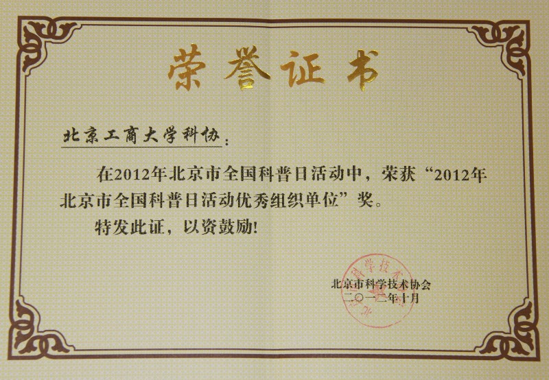 11月1日,2012年北京市全国科普日活动总结表彰大会在北京科技活动中心召开。城区科协、郊区科协、企业科协、高校科协的工作人员参加了会议。我校科协获得“2012年北京市全国科普日活动优秀组织单位”。